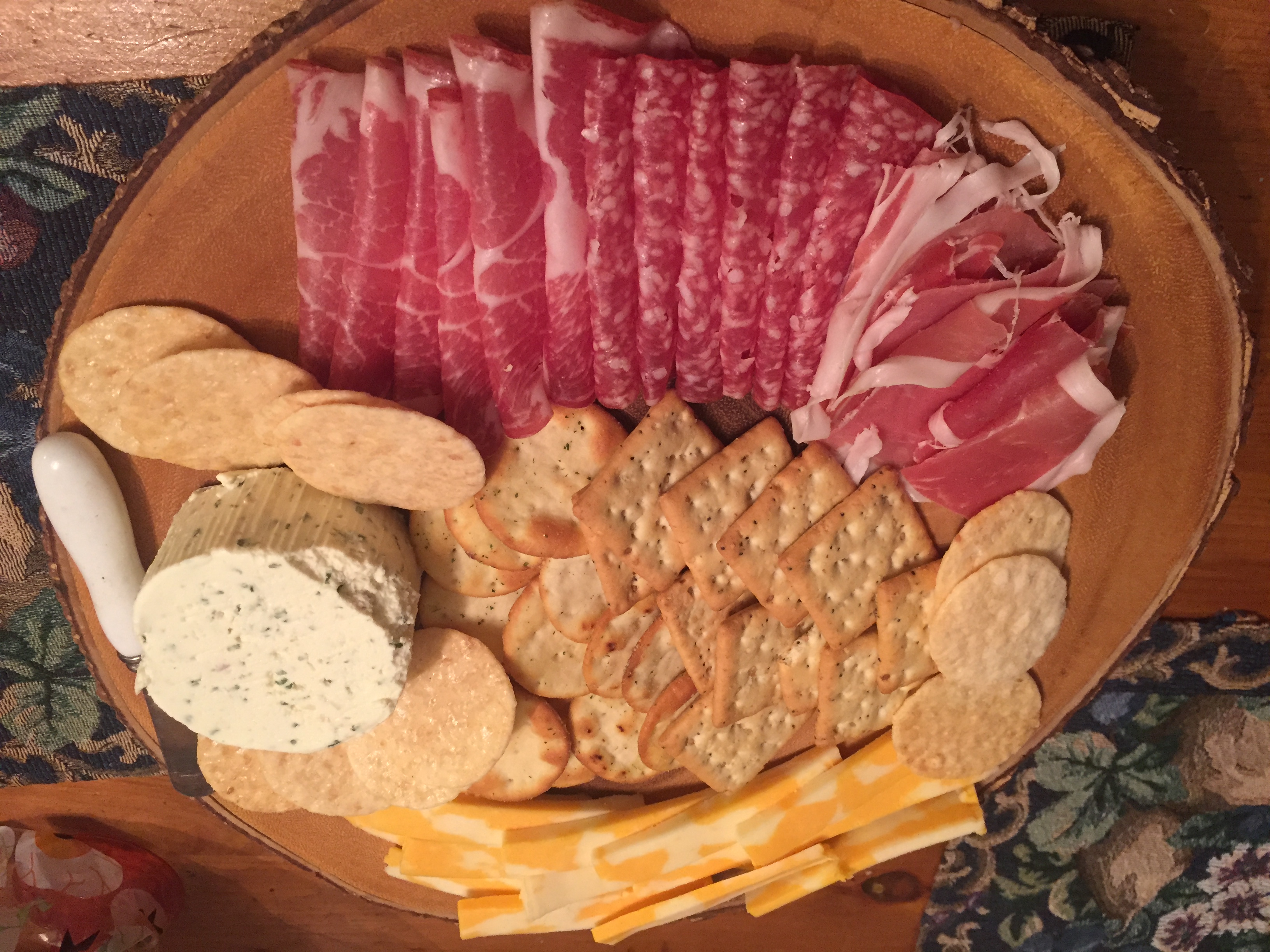 We had a mini charcuterie board last night when we had the Yokoyamas over for dinner. We had salami and Old Croc smoked cheddar cheese from Denningers, antipasto and crackers, and of course a side of potato chips!