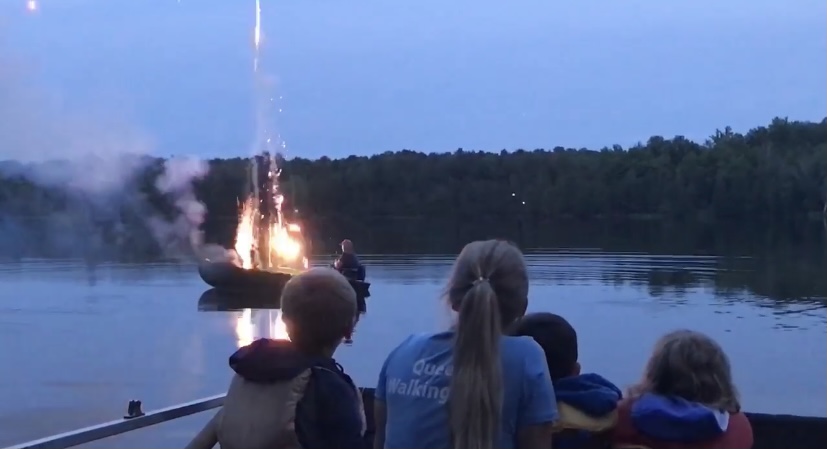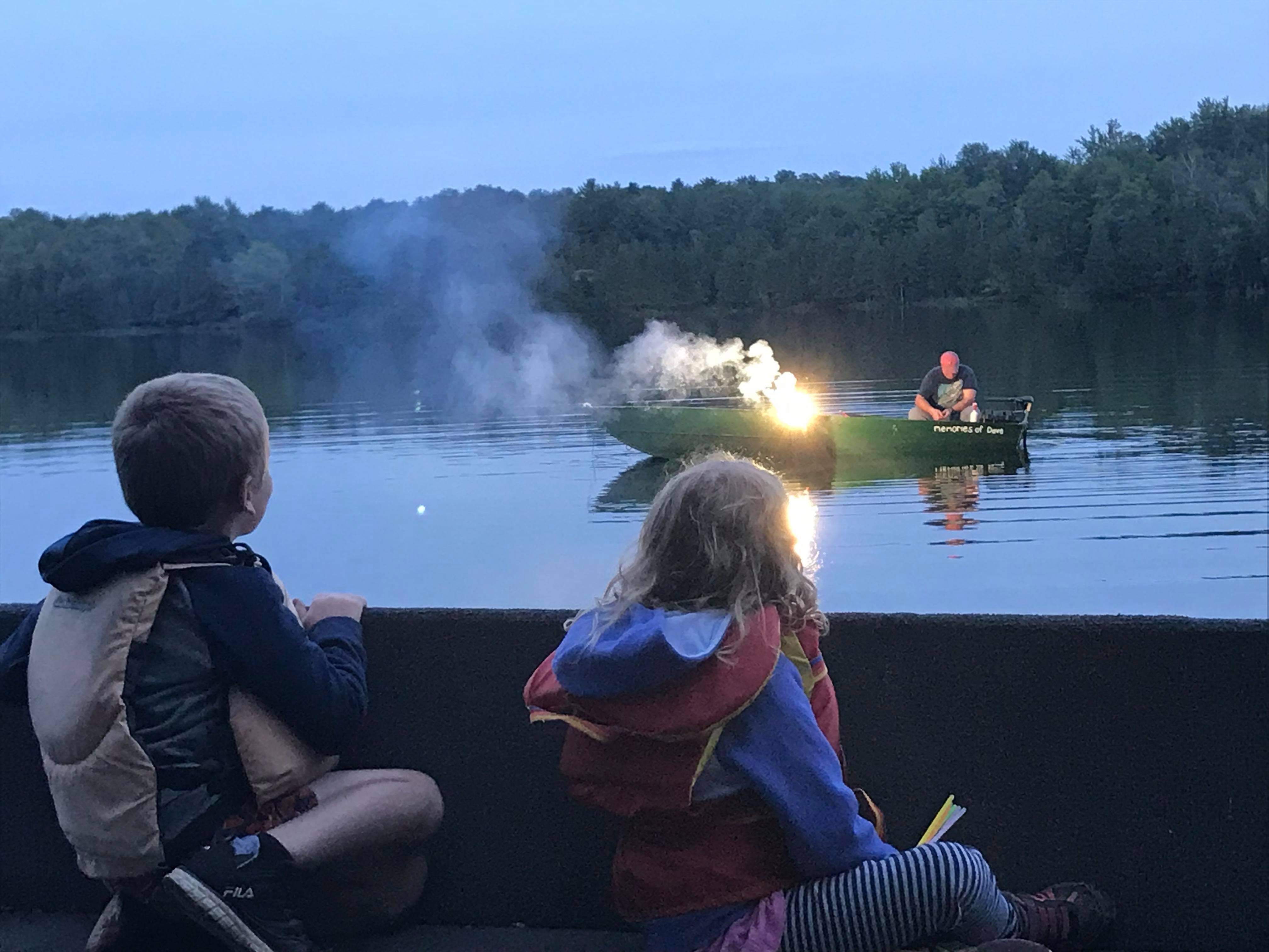 It was a warm summer evening, one of those nights when the air hangs heavily like wet clothes on a clothesline and the water is as still as glass. Shortly after eight, we headed down to the lake and piled in boats and kayaks. My neighbour Bruno was the pyrotechnician. He devised an ingenious launching pad in his boat (he only has a trolling motor, no gas can!) so he could light the fireworks, then swing the wooden stick that was serving as a launch pad away out into the water for safety.