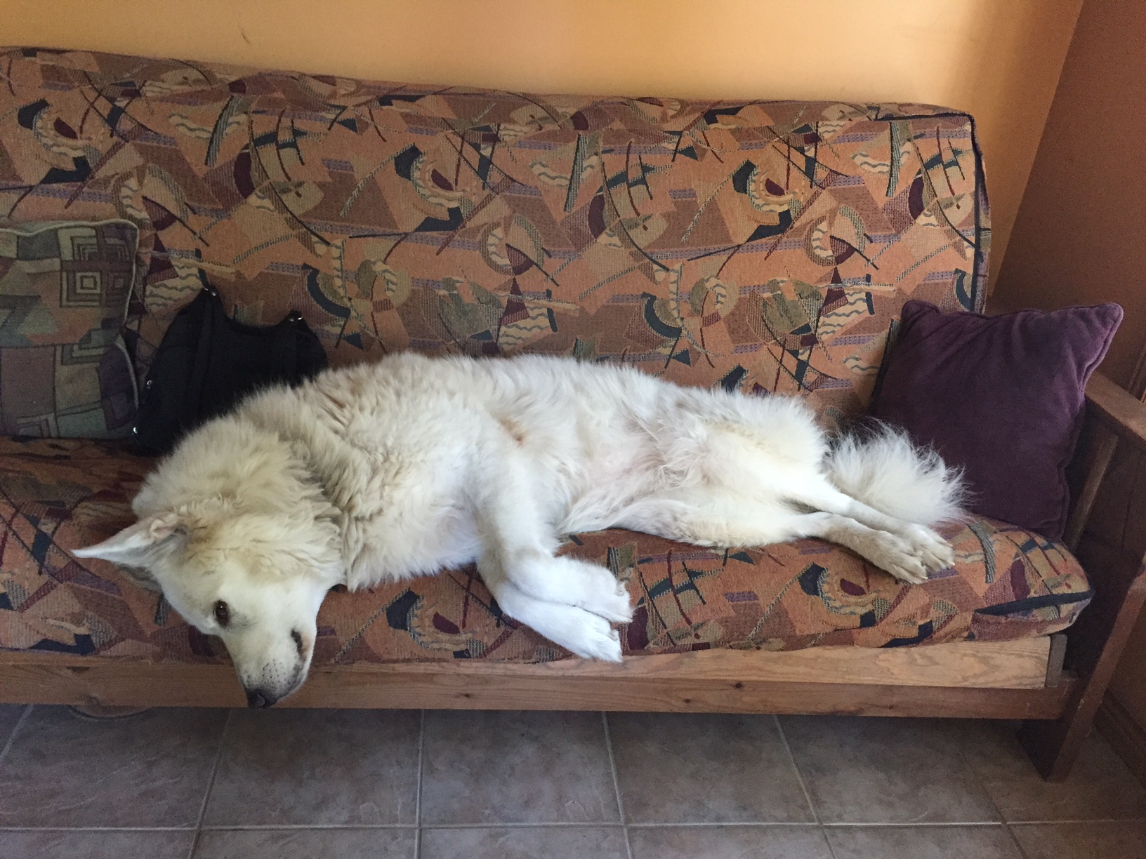 Bella is sprawled full-length on the futon, one eye half-open. Murphy is lying quietly at my feet, occasionally stirring to scratch an itch.