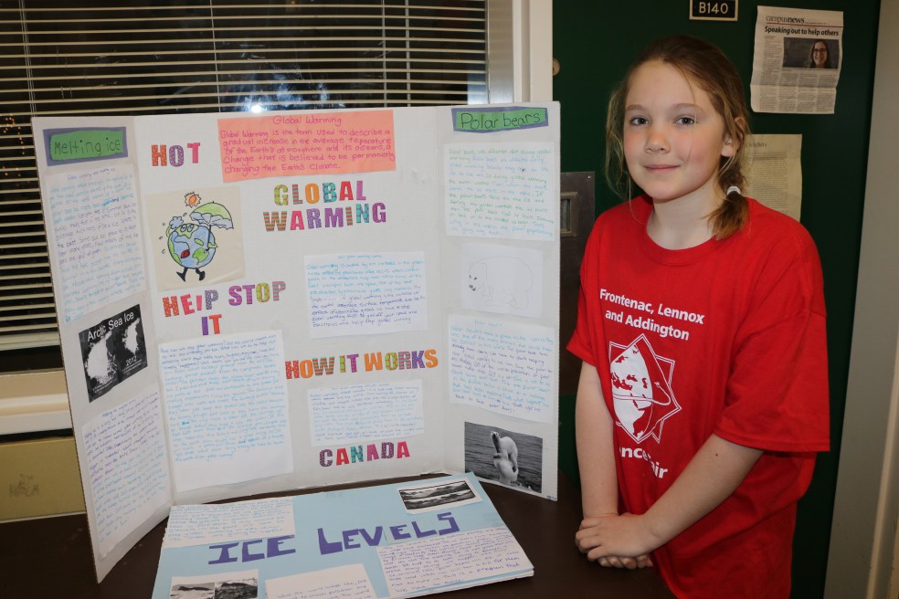 Last week, I had the opportunity to spend an hour at the Frontenac, Lennox and Addington Science Fair at Queen’s University. The fair is for students in grade 5-12 and this year there were 289 exhibits. Clare was the very first student to register her exhibit on global warming.