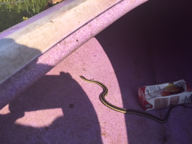 I wanted to go see our loon family, so I rolled over the kayak and pushed off from shore. I always check my kayak before I start paddling in case there are any bugs, frogs or other creatures in it. Half way across the lake I realized I had a stowaway– a little garter snake who was slithering up beside my seat. He was a well behaved passenger and just curled up in front of my kayak for the rest of the trip.